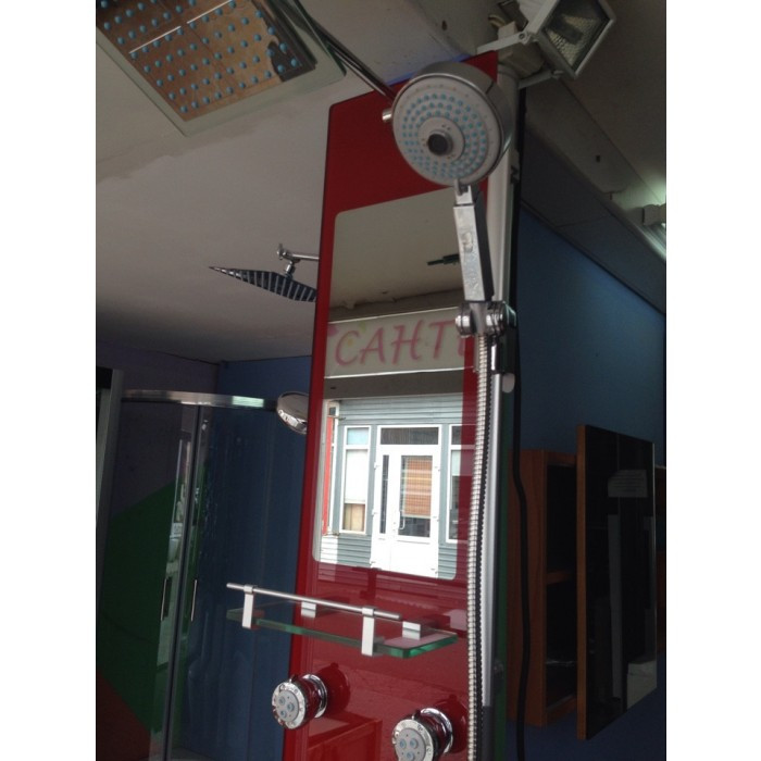 Душова панель має чотири регульовані форсунки гідромасажу і вилив (для ванни). Також в комплектацію входить скляна поличка з обмежувачем і дзеркало.