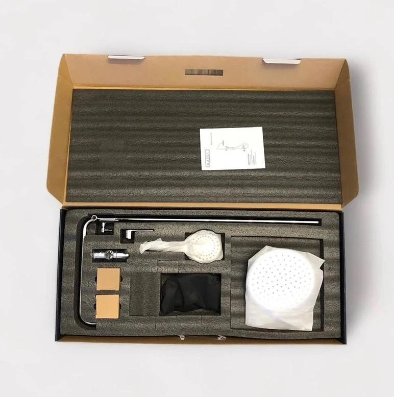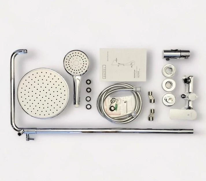 🔹 Повний комплект – верхній душ, вилив, душова штанга, змішувач, кронштейн, ручна лійка, тримач для душу, шланг для душа.