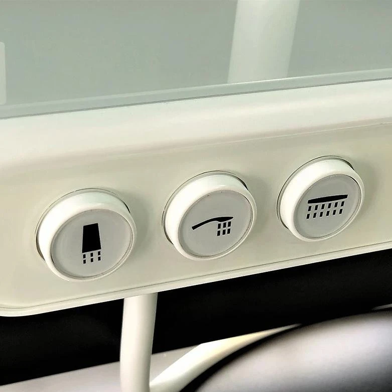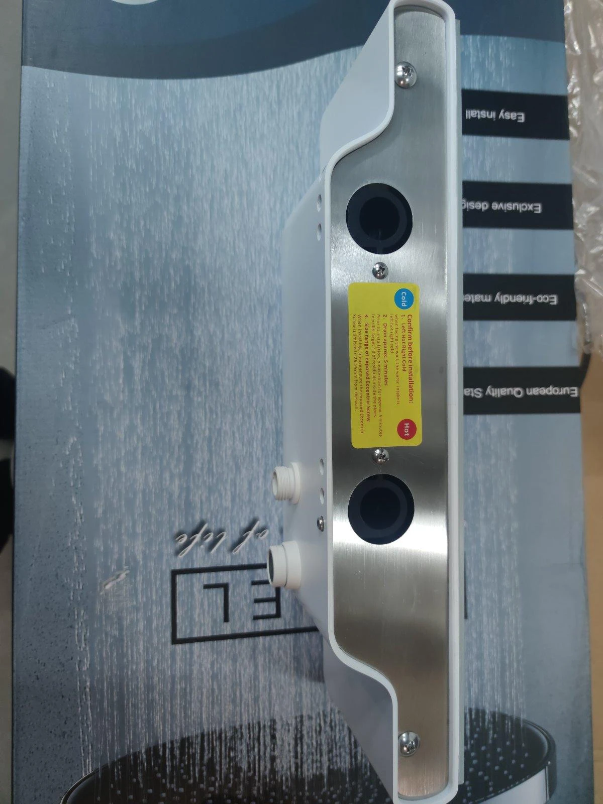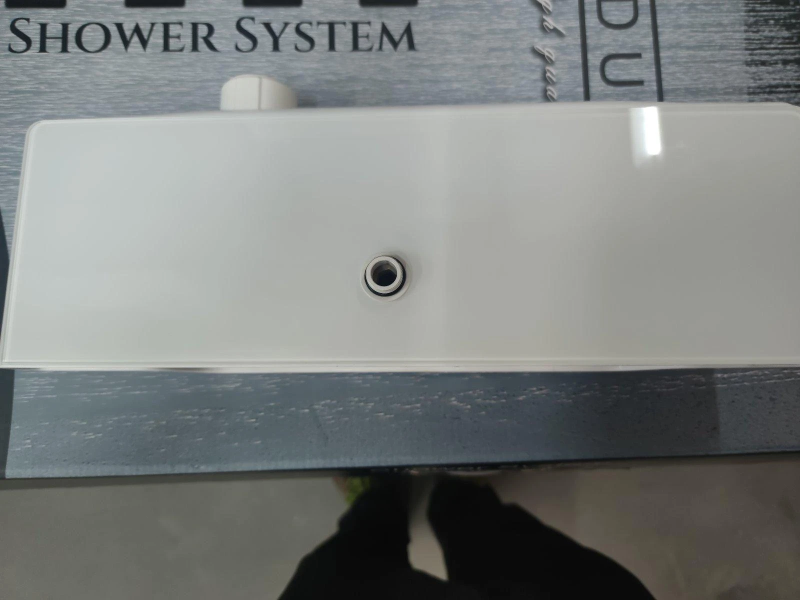 - У системи прямокутний регульований по нахилу верхній душ з функцією тропічний дощ. Розмір верхньої лійки 34х22 см.