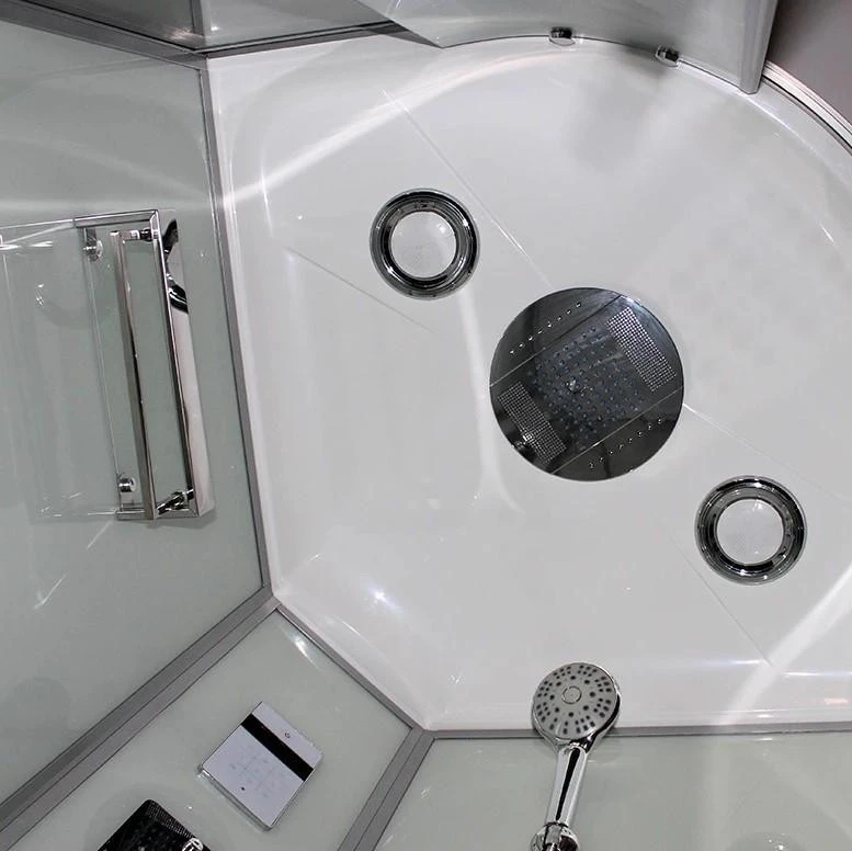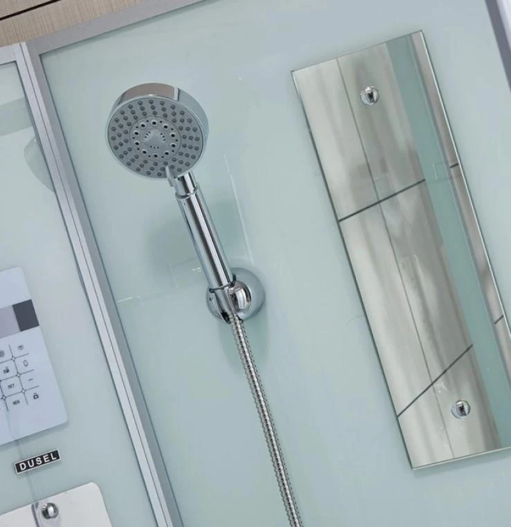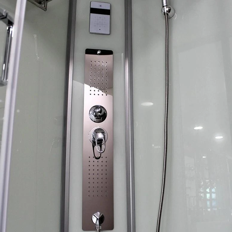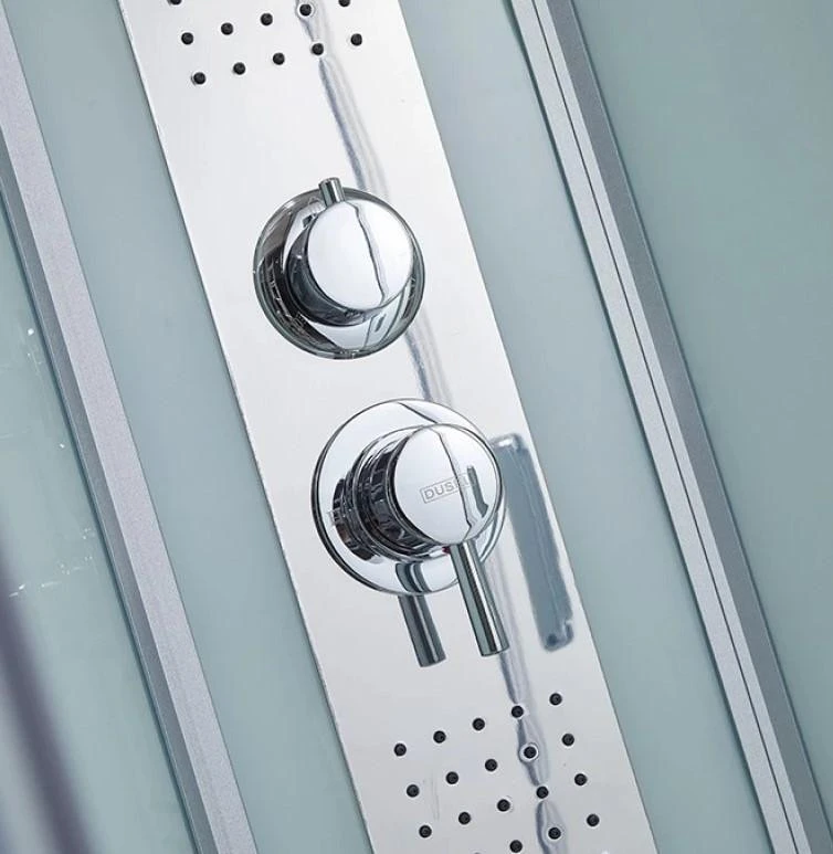 Бокс оснащений функцією гідромасажу, комплектується аксесуарами у вигляді полки для шампуню, ручок, а також електронною панеллю управління, за допомогою якої можна управляти функціями витяжки, радіо, LED підсвічування. Піддон йде в комплекті з сифоном. Змішувач зроблений з латуні, гідромасажна панель з нержавіючої сталі. Верхній душ має функцію "тропічний дощ".