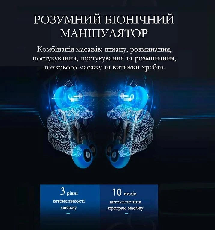 • Можливість вибору зони масажу в ручному режимі із фіксацією роликової каретки. Три зони (в точці, навколо точки, по всій поверхні спини)