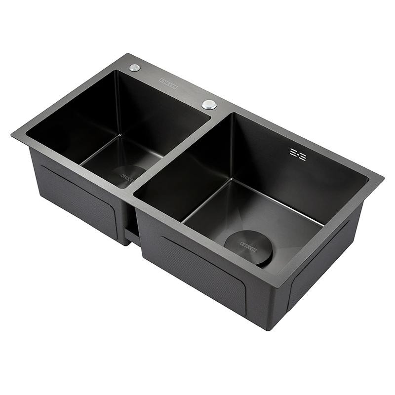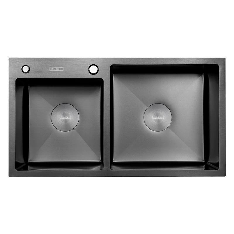 Кухонная мойка из нержавеющей стали DUSEL 780×430×220 мм, 2 чаши, Nano Black, левая