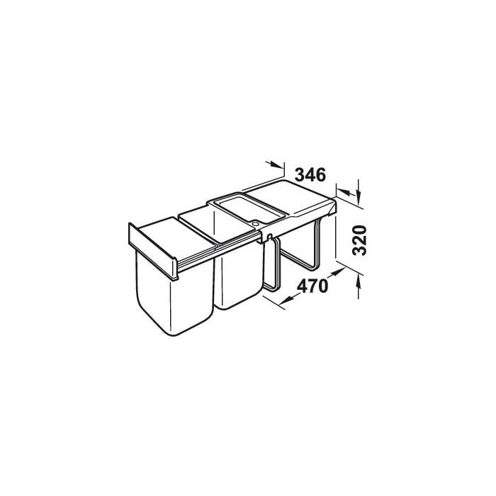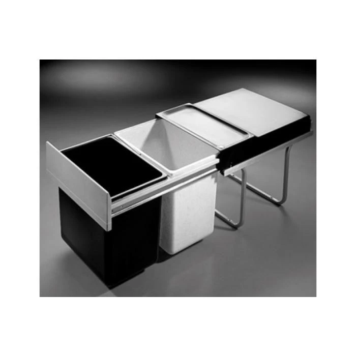 Система оснащена телескопічними напрямними для безшумного висування, а верхня полиця служить для зручного зберігання кухонного начиння. Легкі відра з потайними ручками легко виймаються для прибирання. Монтаж здійснюється до дна шафи, що забезпечує компактність і зручність використання.